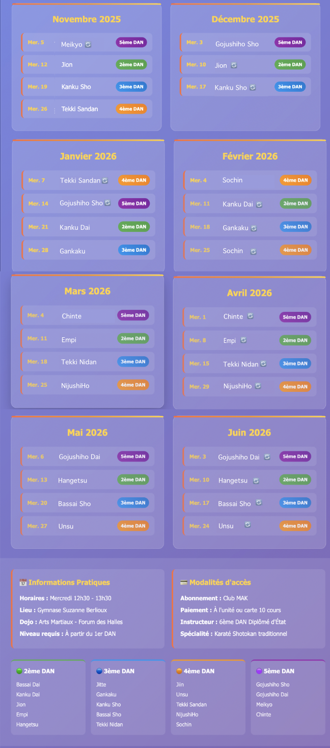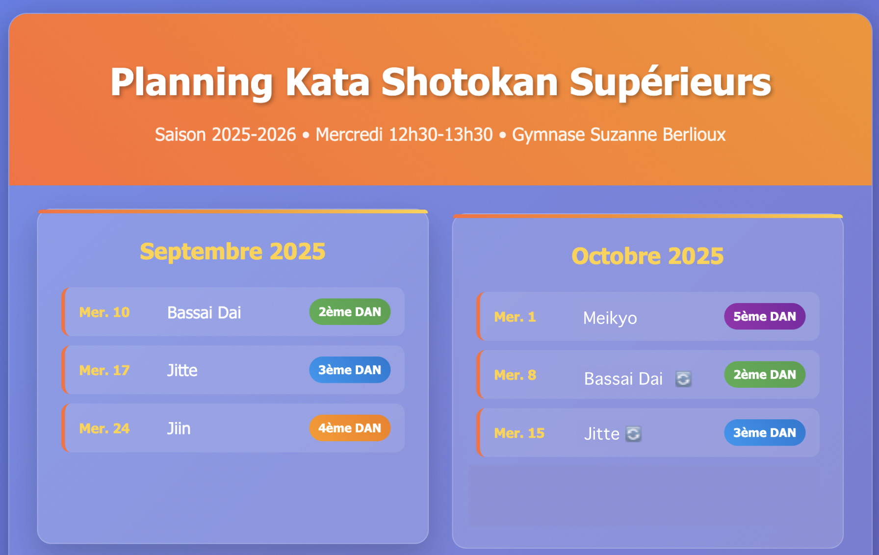 Rejoignez notre cours karaté Paris spécialisé dans les kata supérieurs Shotokan, dispensé par Éric Delannoy, ceinture noire 6ème dan de karaté-do. Ce cours karaté kata Paris d'exception se déroule chaque mercredi de 12h30 à 13h30 au prestigieux gymnase Suzanne Berlioux, en plein cœur de Paris 1er.